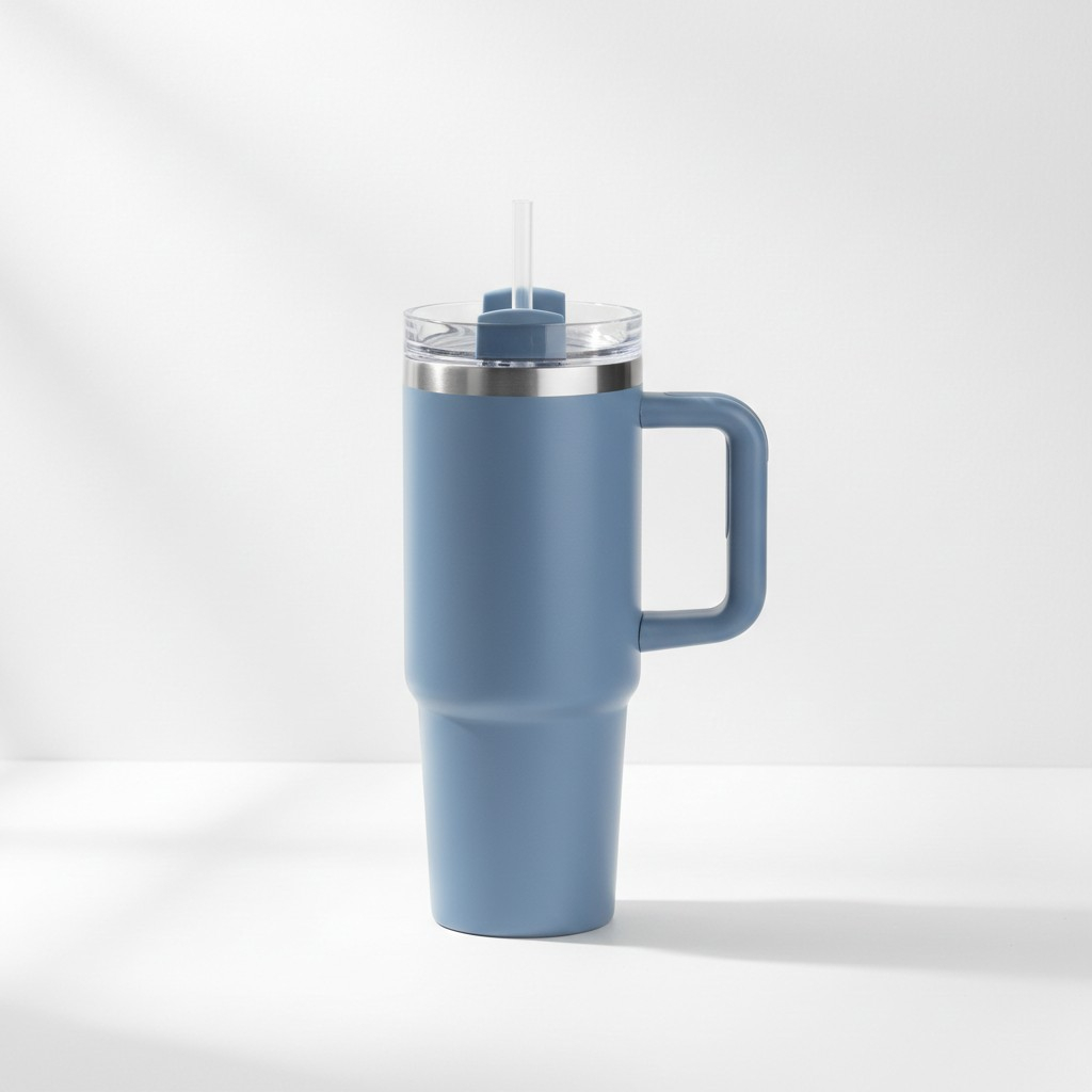 Termos modern tip pahar cu pai, albastru, 900 ml, otel inoxidabil