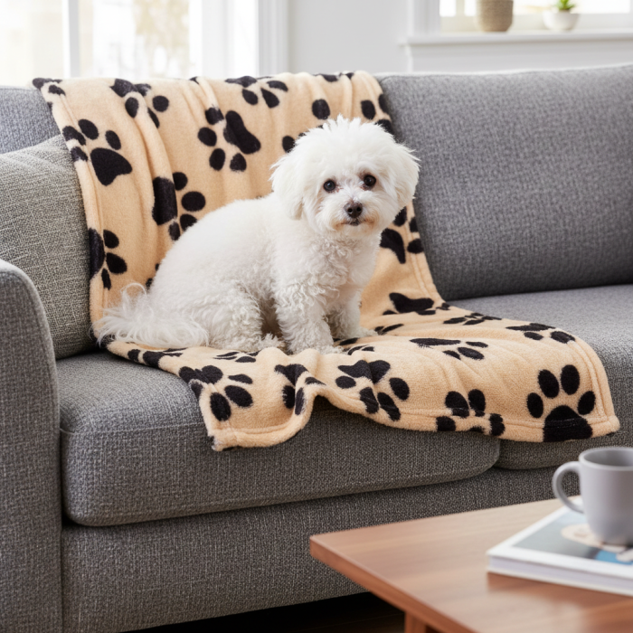 Patura pentru animale de companie cu imprimeu labute este o alegere perfecta pentru confortul si caldura companionului tau.
