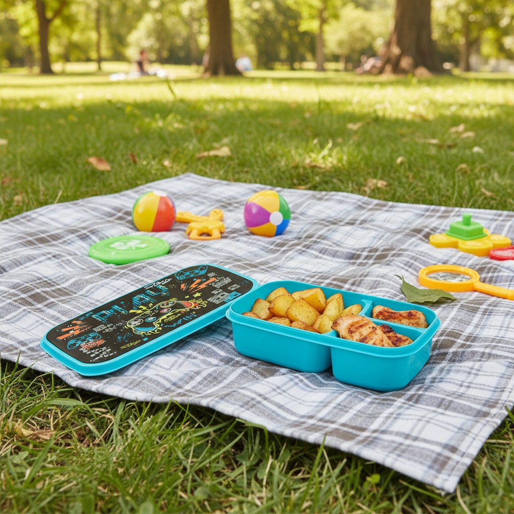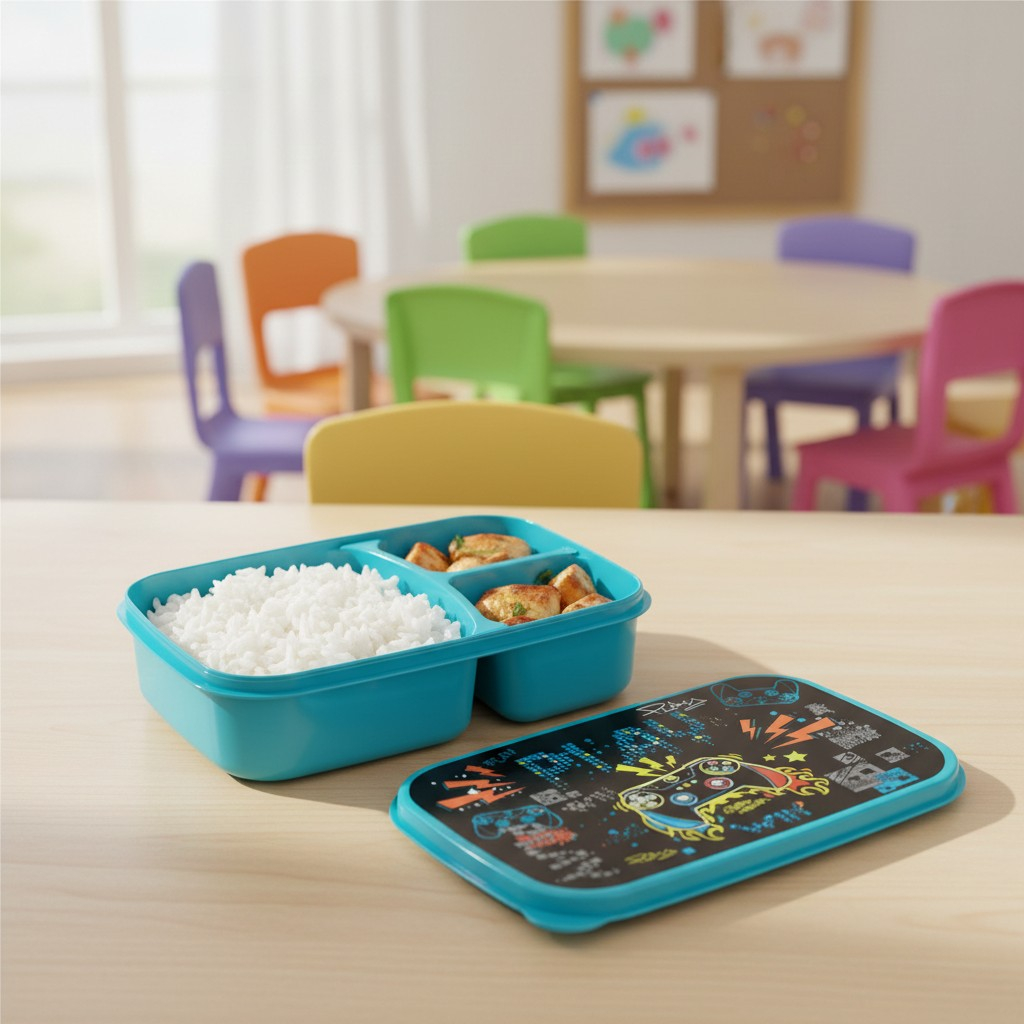Cutie alimentara pentru copii, culoare turcoaz, cu model gamer.