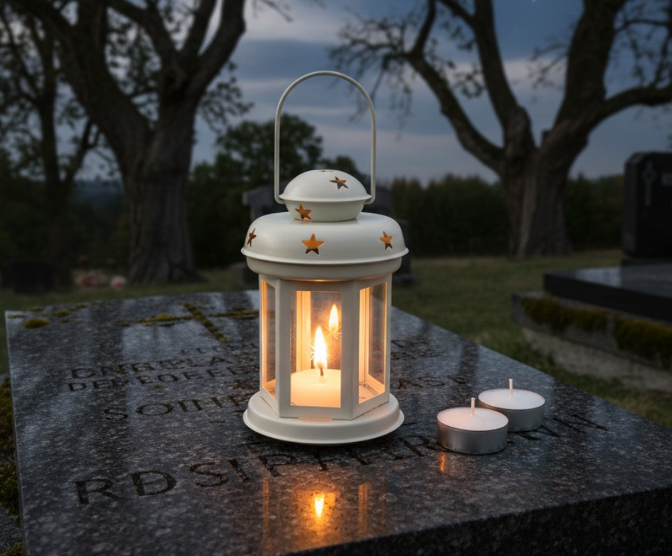 Flacara lumanarii raspandeste o lumina placuta prin modelul decorativ al felinarului.