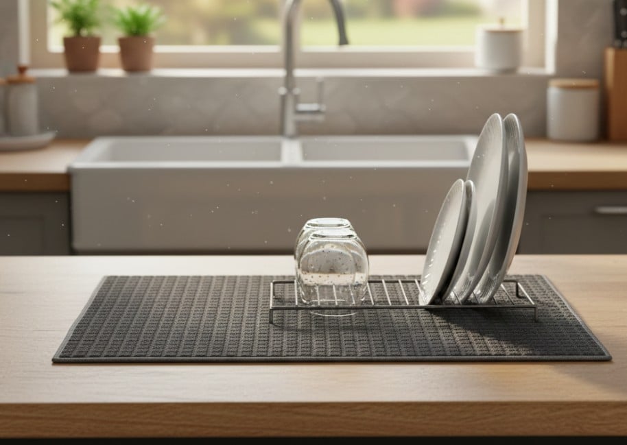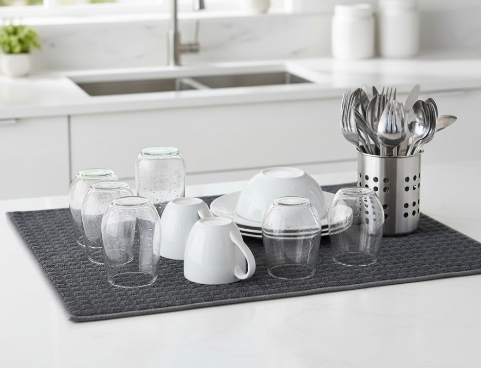 Solutie practica si eficienta pentru uscarea rapida a vaselor, paharelor sau tacamurilor dupa spalare. Fabricat din material textil (poliester) moale si foarte absorbant, retine eficient apa si protejeaza suprafetele de zgarieturi. Culoarea gri neutra se potriveste perfect in orice bucatarie moderna, oferind un aspect curat si ordonat.