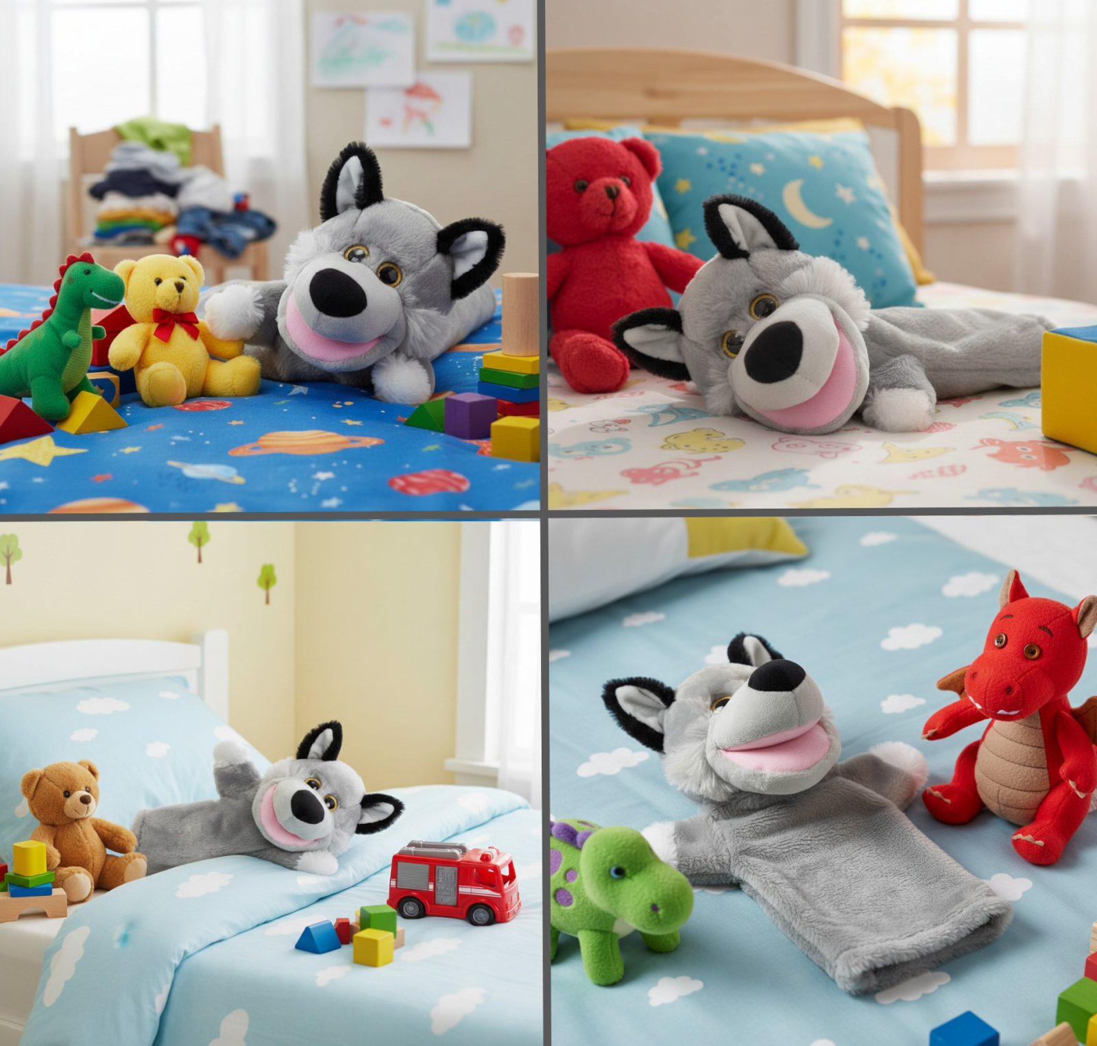 Marioneta din plus, model lup, moale si catifelat, gri, inaltime 28 cm, diametrul baza 15 cm