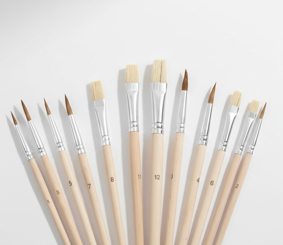 7 pensule au varf rotund, iar 5 pensule au varf plat.