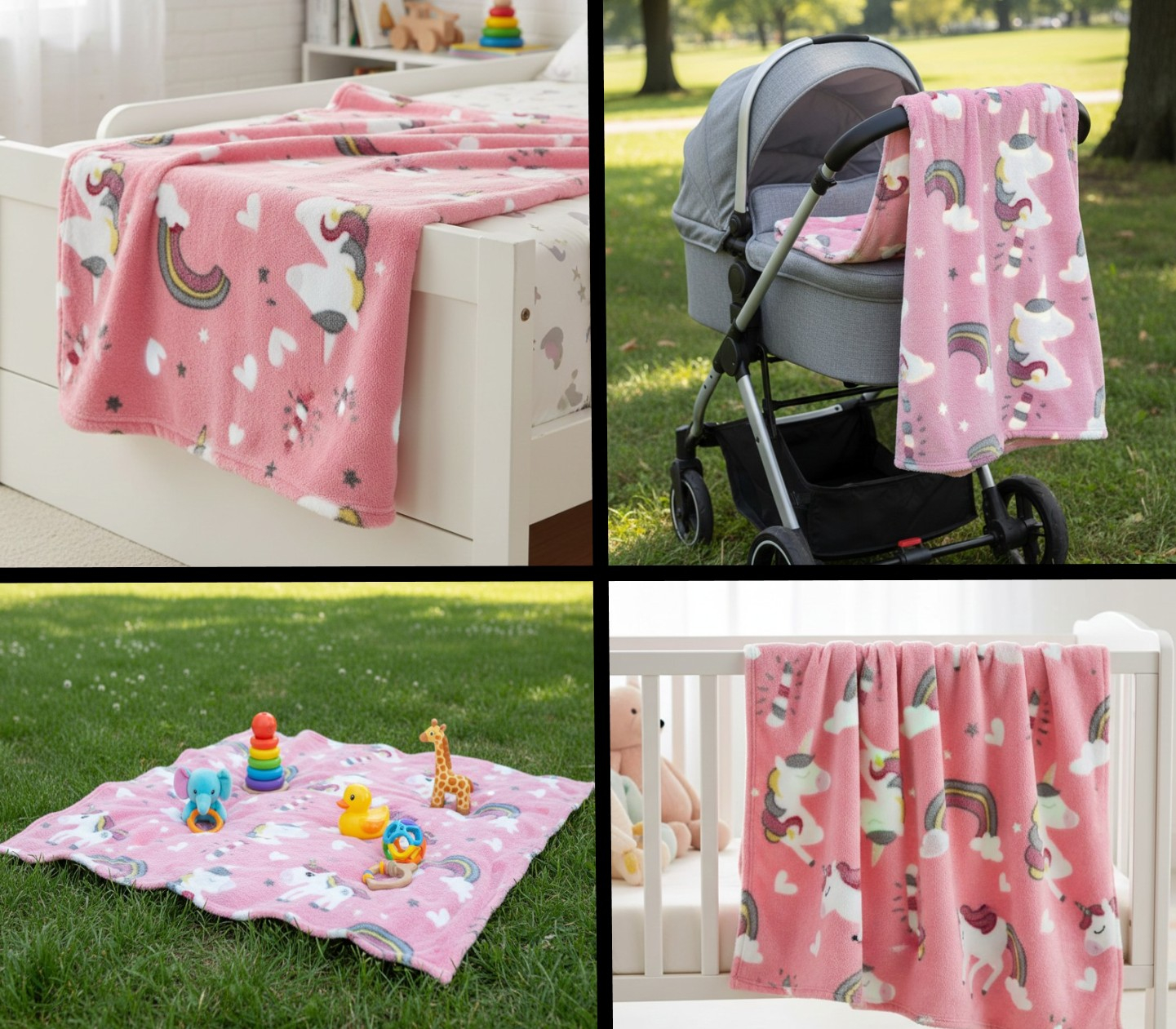 Modelul cu unicorni si efect fosforescent creeaza un aspect jucaus si atractiv, vizibil discret in intuneric dupa expunerea la lumina. Dimensiunea generoasa de 140x100 cm o face potrivita pentru patut, carucior, canapea sau utilizare acasa si in deplasari.