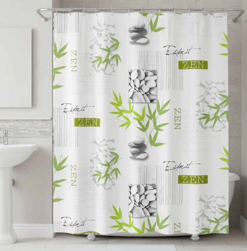 Combina functionalitatea cu estetica, aducand o nota de calm si rafinament in baia ta. Modelul ZEN, cu pietre si ramuri de bambus, creeaza o atmosfera relaxanta, perfecta pentru momentele de destindere. Materialul impermeabil si usor de curatat asigura protectie eficienta impotriva stropilor de apa, iar cele 12 inele incluse permit o montare rapida si stabila.