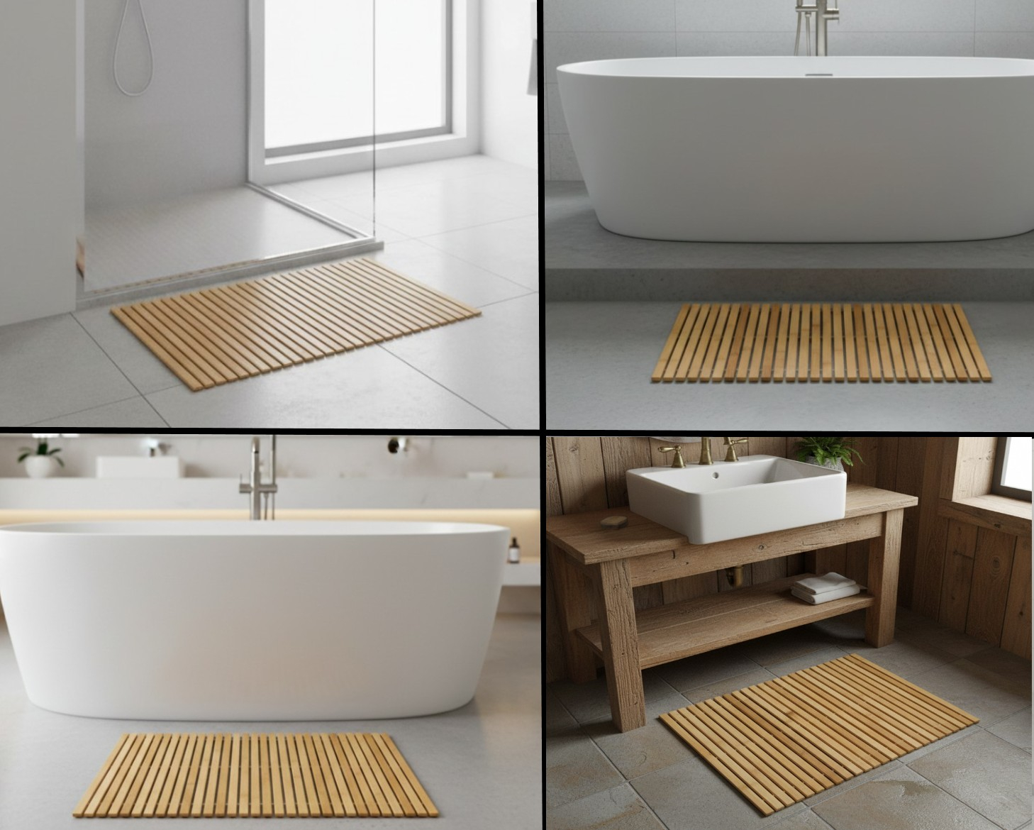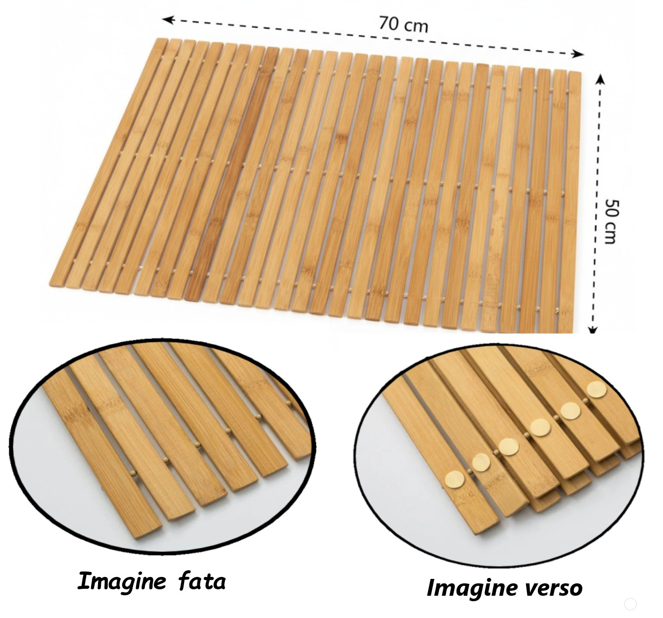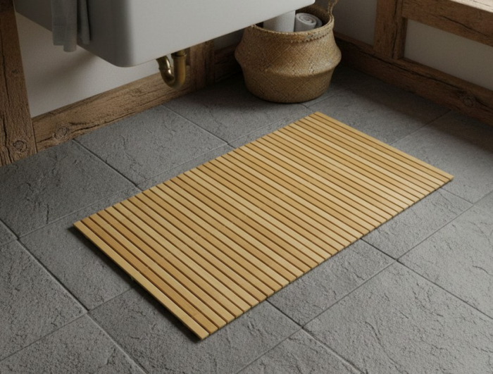Realizat din bambus natural, acesta ofera un aspect modern si aerisit, fiind in acelasi timp rezistent la umiditate si usor de intretinut. Suprafata antialunecare asigura stabilitate si siguranta in utilizare, iar dimensiunea de 70x50 cm il face potrivit pentru diferite zone ale locuintei.