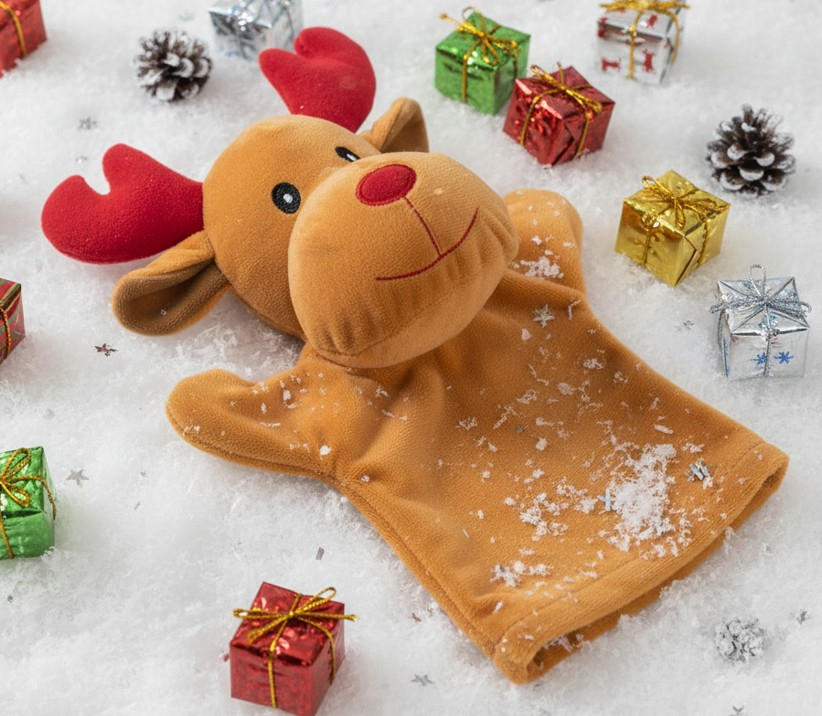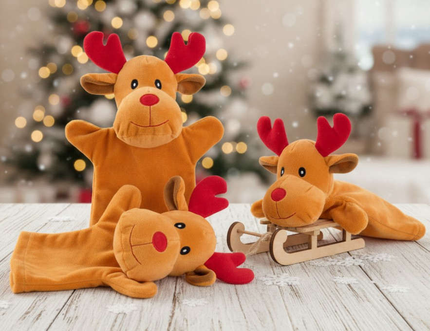 Este o marioneta de plus in forma de ren, destinata jocului de papusi si divertismentului pentru copii.