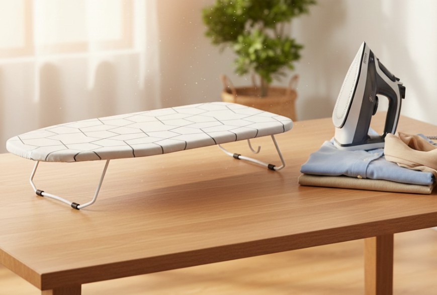 Este o masa de calcat mini, practica si compacta, ideala pentru uz casnic.