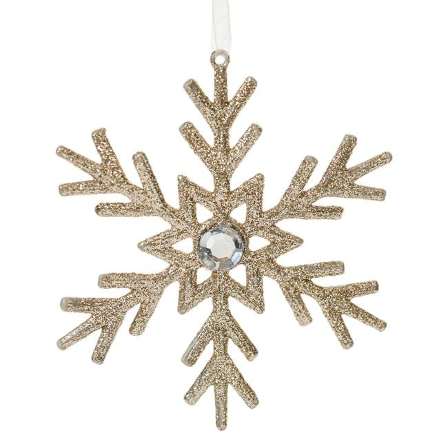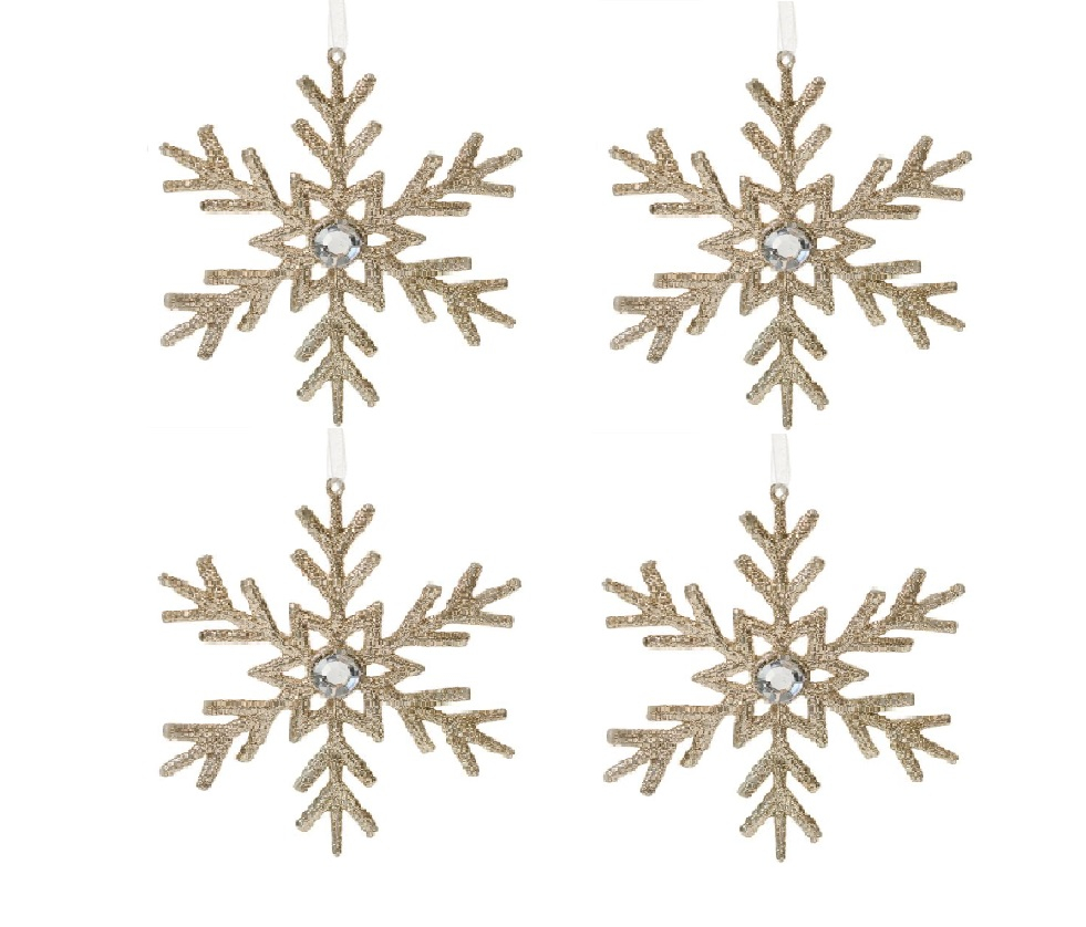 Adauga o nota eleganta si stralucitoare bradului tau de Craciun cu acest set de 4 globuri decorative in forma de fulg de nea, acoperite cu sclipici auriu. Diametrul de 10 cm le face perfecte pentru orice brad, aducand un plus de rafinament si festivitate in decorul tau de sarbatori.