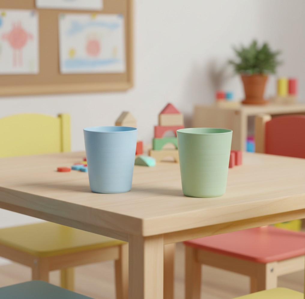 Colorate, rezistente la impact si zgarieturi si usor de prins in mana. Ideale pentru copiii mici care tind sa scape lucrurile din mana si sa verse lichidele atunci cand invata sa manance singuri.